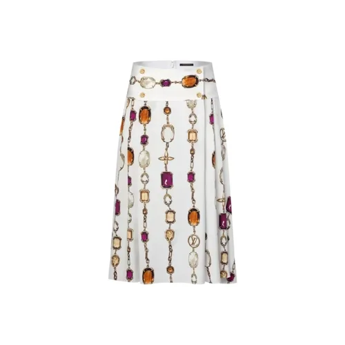 This skirt projects modern elegance in airy silk crepe de chine cut in a versatile mid-length silhouette with pleats to emphasize the fluidity of the fabric. This season’s signature necklace motif features as a playful allover print, while the wide waistband is trimmed with hammered golden buttons for a chic double-breasted effect.