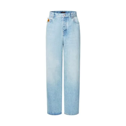 These wide leg jeans, crafted from premium Japanese denim, are a wardrobe essential enhanced with the Louis Vuitton savoir-faire. With their timeless light blue wash and their statement silhouette, they can be effortlessly styled with any look. Exclusive details include tobacco-toned topstitching, an embroidered LV signature on a rear pocket and signed nubuck patches on the ticket pocket and waist.